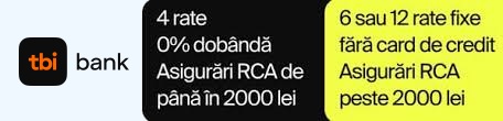 Pentru plata prin card de cumparaturi sau prin TBI Bank pana la 2000 lei, nu se percepe nicio dobanda, suma fiind impartita in 3, respectiv 4 rate egale pentru TBI.